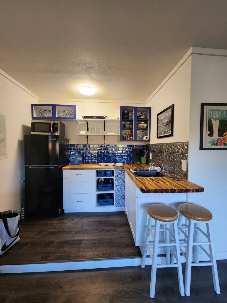 힐로 에어비앤비 숙소의 키친. 위에 전기 인덕션 2구가 있어 꺼내서 쓸 수 있고 취사 가능. 게스트를 위해 코나커피를 비롯해 각종 차와 소스들, 아침에 먹을 오트밀과 쿠키는 이곳에도 준비되어 있었다.