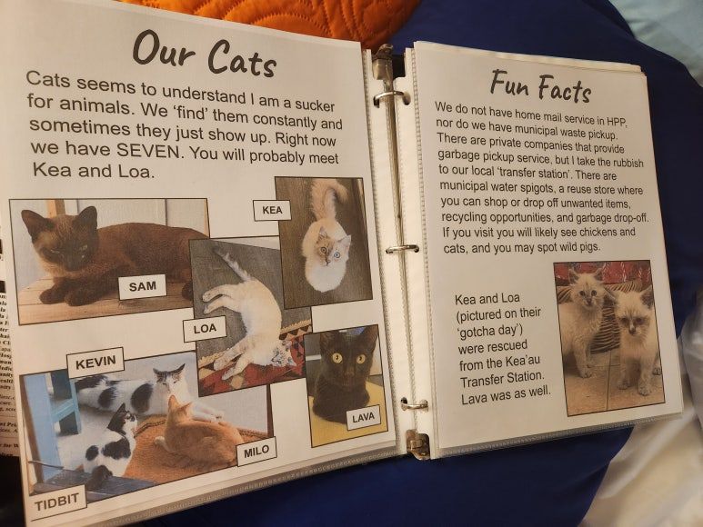 코나 숙소에는 다녀가면서 남기는 여행객들의 메모장이 있어서 아이들과 간단하게 영어로 감사인사를 남기고 왔다. 힐로 숙소의 집 소개를 위한 앨범에는 호스트와 아이들 소개, 동물들 소개, 집에 구비된 물품들, 주변 맛집, 카페, 병원, 집 주변에서 갈 만한 관광지들이 mile로 자세히 표기되어 도움이 많이 되었다.