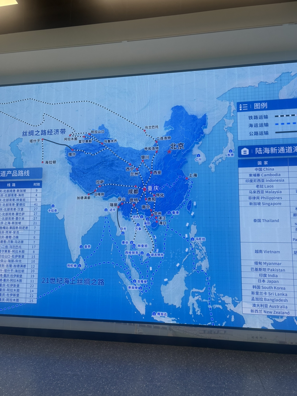 충칭 협력 물류기업인 <서부육해신통도(西部陆海新通道, Western Land-Sea New Corridor)>를 방문하여, 관제센터에서 물류의 흐름을 직접 볼 수 있었다. 이 통로는 철도, 해운, 도로 등 다양한 운송 수단을 유기적으로 연결해 중국 서부와 동남아시아는 물론 세계 각지와 교역을 이어주는 다리 역할을 하고 있었다. 충칭은 이 복합 물류의 중심지로, 활발히 움직이는 항구와 물류 허브가 모여 있어 마치 경제의 심장처럼 통로를 숨 쉬게 하고 있었다. 특히 철도와 해운을 결합한 ‘복합 운송’ 방식은 화물을 빠르고 안정적으로 이동시키며, 중국 남부의 광시, 윈난을 거쳐 아세안 국가들과의 교역도 한층 활발하게 만들어 주고 있었다. 최근 몇 년 사이 목적지 항구 수가 크게 늘어나면서, 서부육해신통도는 국제 물류 통로로서의 입지를 더욱 굳건히 하고 있는 기업임을 알 수 있었다. 수많은 물류들이 자동화 시스템을 통해서 관리되고 있는 것을 보고 들으며 글로벌 물류의 위대함을 느꼈다.