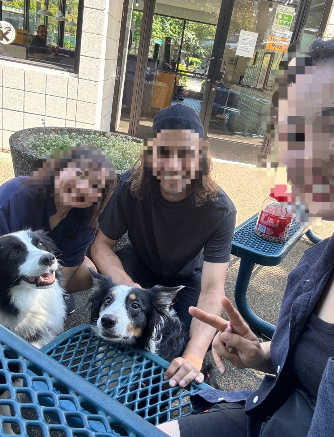 햄버거를 가져다주며 그 직원은 개들과 인사해도 되는지 물어왔다. "Of course!" 개들은 자신들을 좋아하는 사람을 귀신같이 알아본다. 한들이는 꼬리를 신나게 흔들며 애교를 부렸다. 그가 강아지들 간식을 줘도 되냐고 묻는다. "Sure!" 직원이 가게 안으로 들어가더니 커다란 간식통과 함께 나왔다. 간식에 눈이 반짝인 멈머들은 평소보다 더 훨씬 말 잘 듣는 착한 개들이 되었다. 그는 강아지들이 너무 착하고 예쁘다고 한참을 쓰다듬다가 안에서 다른 직원이 불러 마지못해 들어갔다. 그 직원은 그 후로도 우리가 뭐 불편한 건 없는지, 잘 살펴 봐주었고, 우린 떠나기 전 같이 사진을 찍자고 요청했다.