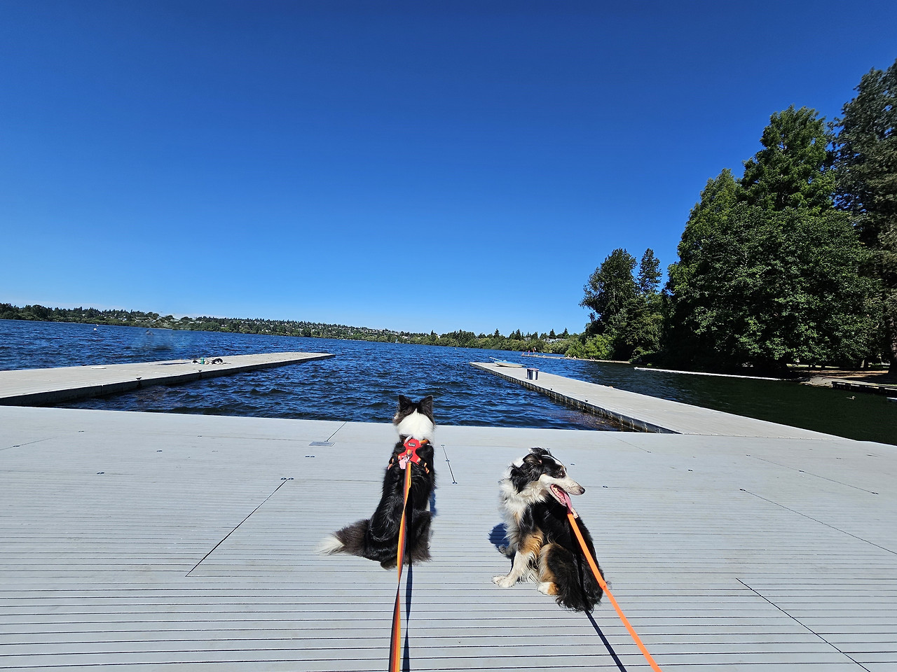 넓은 펫파크에서 맘껏 뛰놀고, 바로 옆 커다란 호수로 향했다. 코발트빛의 호수를 보자마자 한들이는 수영하겠다며 엄청 끙끙거렸다. 하지만 '수영 금지' 팻말이 있어서 아쉽지만 자제시켰다. 대신 우리는 호숫가 산책로를 걸었다. 파아란 잔디와 짙푸른 호수, 아름드리나무가 어우러진 공원은 걷고 쉬는 모든 이들에게 호수 같은 잔잔한 행복을 전해주었다. 잔디에서 햇살을 즐기는 사람들, 신선항 공기를 마쉬며 뛰는 사람들, 아이들의 꺄르르 웃음소리, 그리고 주인과 함께 걷는 반려견들의 미소까지. 우리 역시 "Hi, Sweeties"라는 인사를 받으며 그 풍경 속에 자연스레 스며들었다.