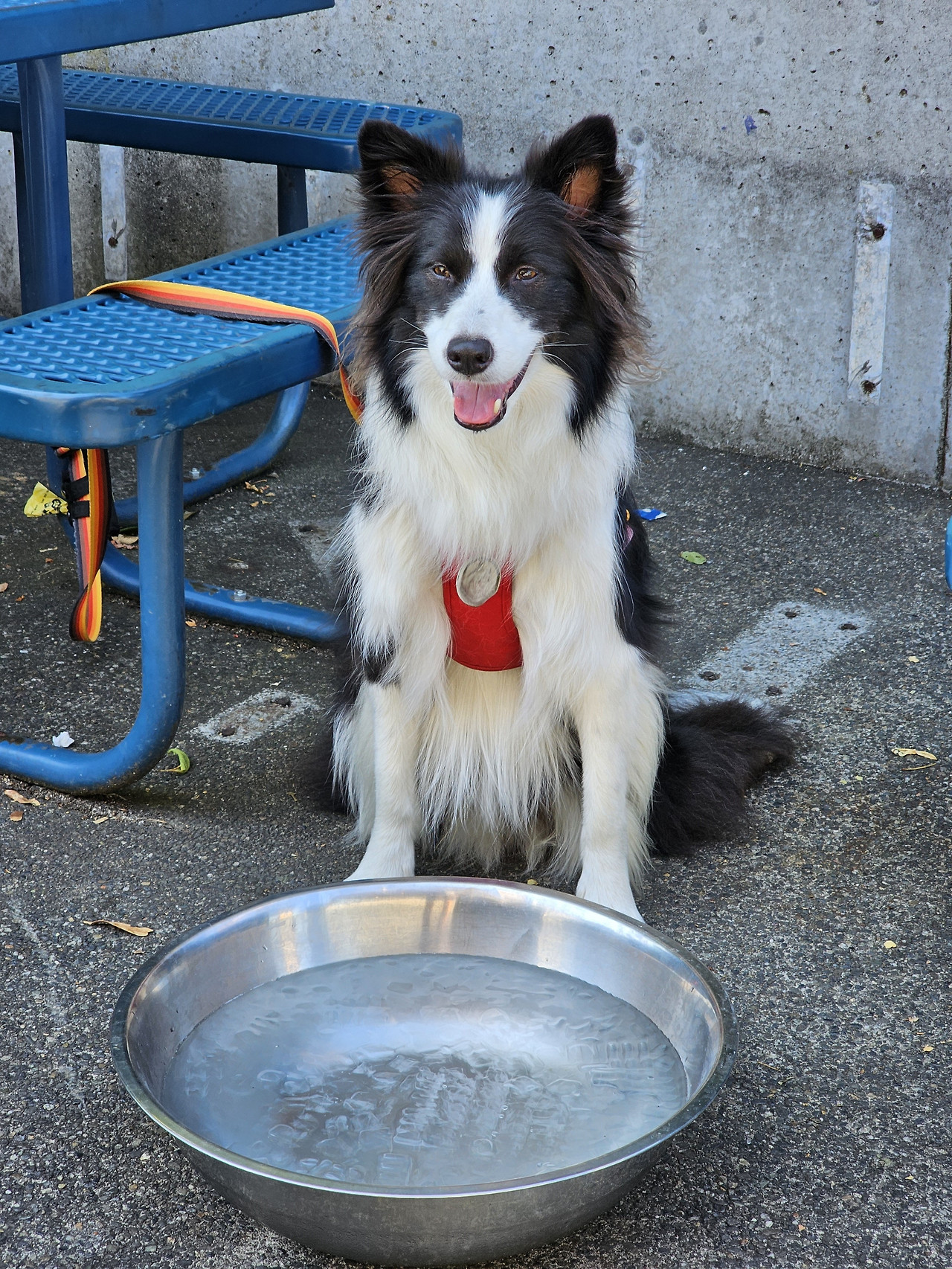 그런데 야외 좌석에 커다란 양동이에 얼음물이 가득 있었다! 역시.. 사람물은 사 먹어야 해도, 개들을 위한 물은 언제나 준비되어 있는 캐나다와 미국이었다! 받아놓은 물도 방금 떠온 듯 아주 깨끗했다. 멈머들은 그 자리에 철퍼덕 드러누워 시원하게 물을 마셨다. 우리는 개들을 묶어 놓고 햄버거를 주문하러 가게 안으로 들어갔다. 직원은 밖에 있는 강아지들을 보며 반갑게 인사했고, 이름을 물었다. 처음 가는 곳이라 주문방식이 낯설어 살짝 긴장했는데, 너무도 친절하게 응대해 줘서 마음이 놓였다. 밖에서 강아지들과 먹고 가겠다고 하니, 햄버거를 자리까지 가져다주겠다고 했다.