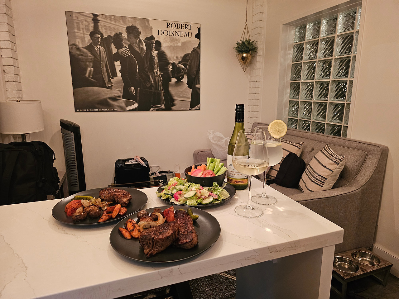 한 번은 화력이 진짜 좋은 주방이 있는 숙소를 정했다. 고가의 주방이 보여주듯 숙소비도 비쌌고, 심지어 연박만 가능해서 고민을 많이 했다. 근데 꼭 한 번은 고화력의 주방에서 스테이크를 맛나게 굽고 싶었다. 하지만 굳이 단 하나의 이유로 높은 비용을 치르기엔 아니다 싶어 포기하려고 했다. "언니, 거기 아님 언제 우리가 캐나다 가서 스테이크를 구워 먹어 보겠어요~ 여기서도 맛있는 언니의 스테이크가 더 맛있어지겠어요. 우리 거기 가요! 그것만으로도 충분해요~"라고 맘 좋게 말해주었다.