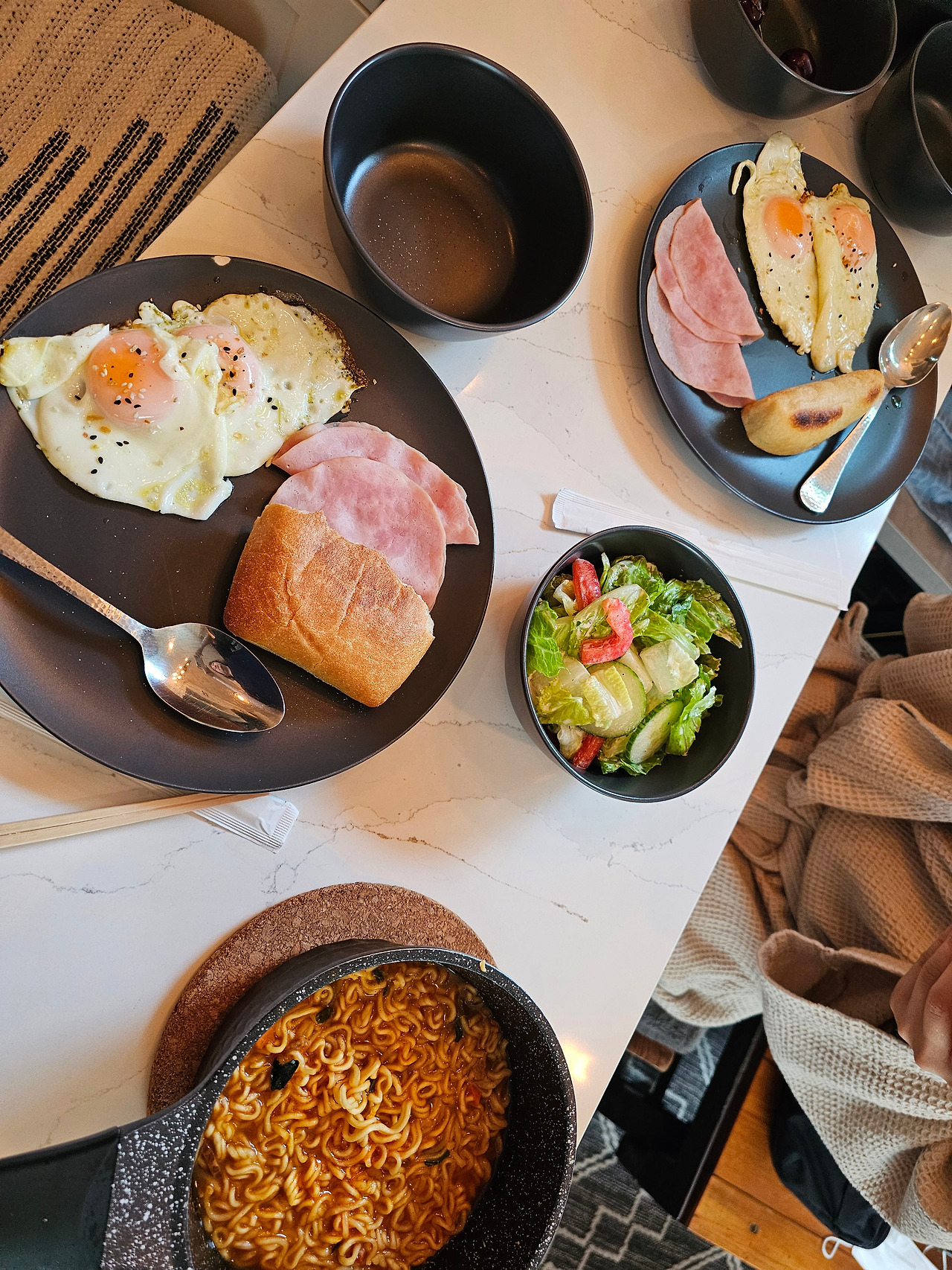 머무는 동네마다 그 지역 마트에 갔다. 식재료가 저렴하고 채소들이 싱싱해서 주로 샐러드를 해 먹었다. 샐러드를 메인(?)으로 삼고 거기에 육류 단백질을 곁들이는 식이다. 한식 러버이며 국물을 사랑하는 스냅이네를 위해 라면도 몇 봉지 사서 같이 끓여 먹었다. 다양한 종류의 우유와 요거트, 치즈 등 유재품도 넉넉히 즐겼다.