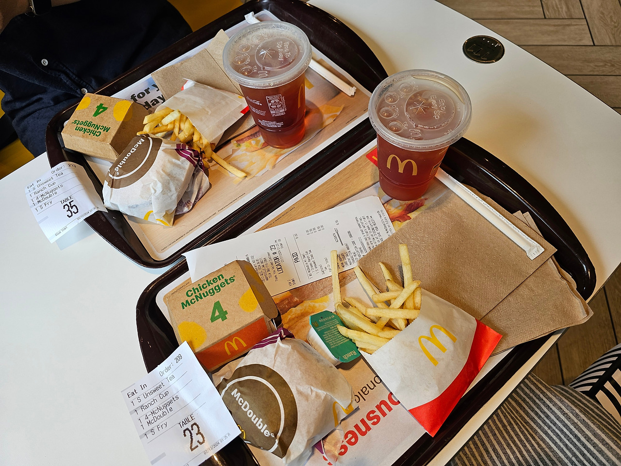 그리고 미국 맥도날드에는 달지 않은 진짜 아이스티가 있다! 캐나다로 돌아오는 길에 나이키 쇼핑의 부푼 꿈을 안고 있는 스냅이네를 위해 근처 아웃렛에 들렀다. 때마침 점심시간이라서 멈머들은 매장 밖 그늘 벤치에 독파킹을 해두고, 우리는 맥도날드에 갔다.