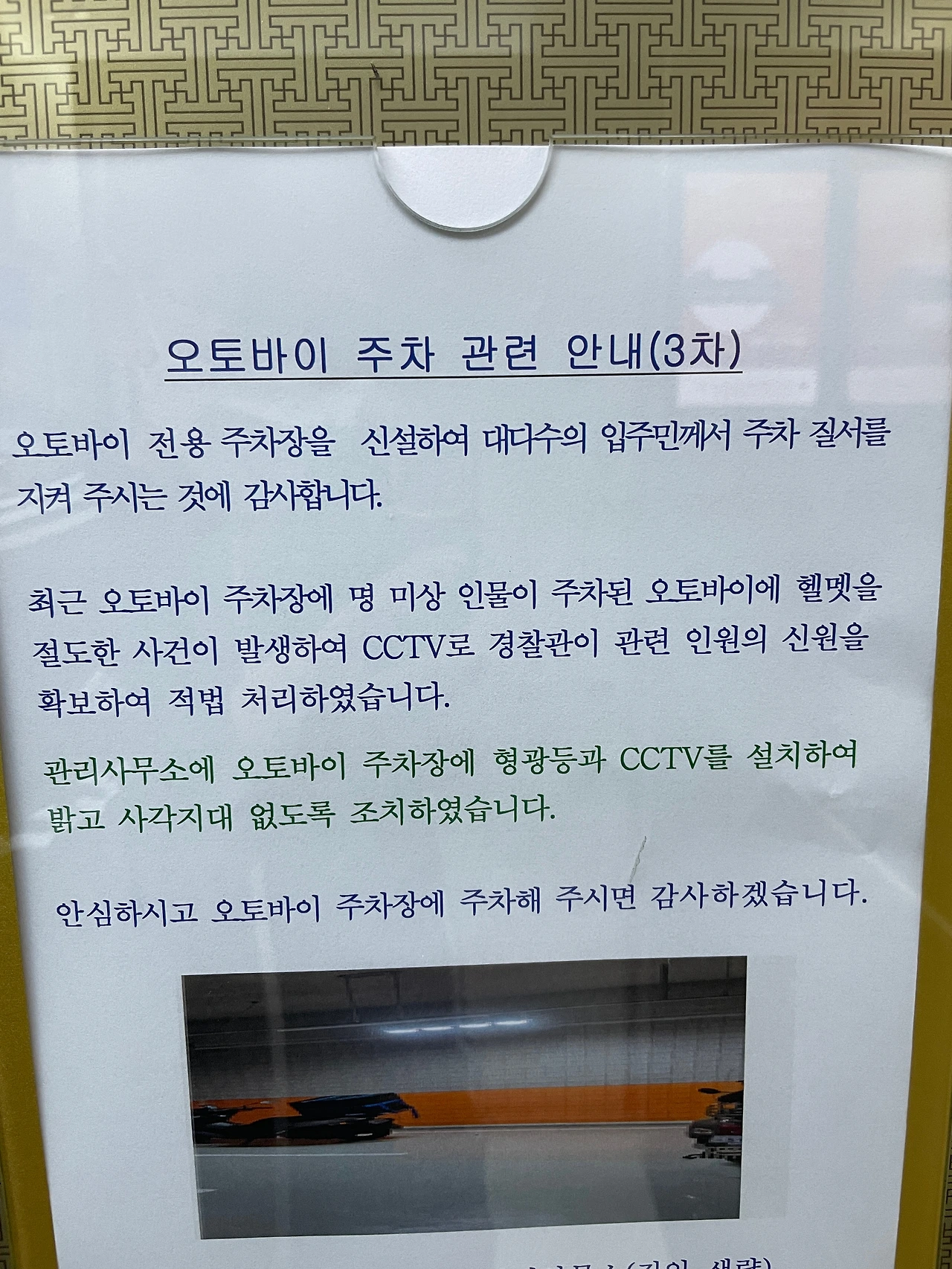 지하 주차장에 오토바이 헬멧을 훔쳐간 사건이 있었다. 다행히 범인을 잡았다고 한다.