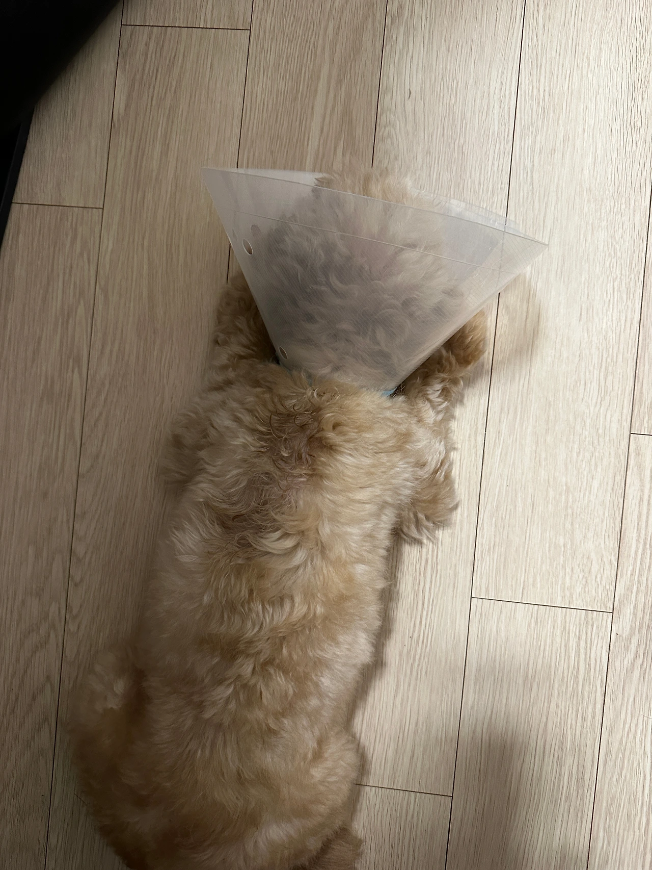 강아지는 한번 병원에 가면 기본 10만원 정도씩은 나와서 걱정을 했다. 이번에는 원장님이 비용을 많이 할인해주신다고해서 5만원을 냈다. 강아지 목 보호대를 하고 집으로 왔다. 천방지축 로이가 힘이 없는지, 계속 누워만 있다. 밥과 간식을 먹이고, 가루약을 물에 타서 주사기로 먹였다.