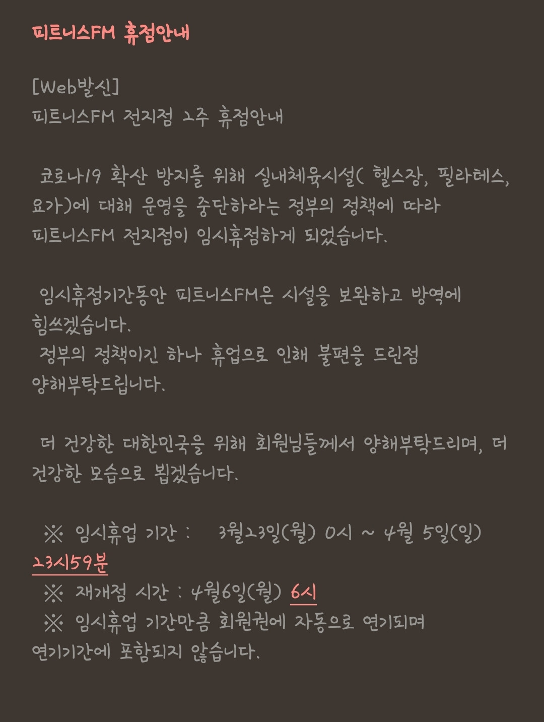 그런데..... 바로 지난 토요일(3월 21일) 실내체육시설 휴관 권고지침이 내려졌고, 다음날 저녁에 헬스장에서 연락이 왔다.