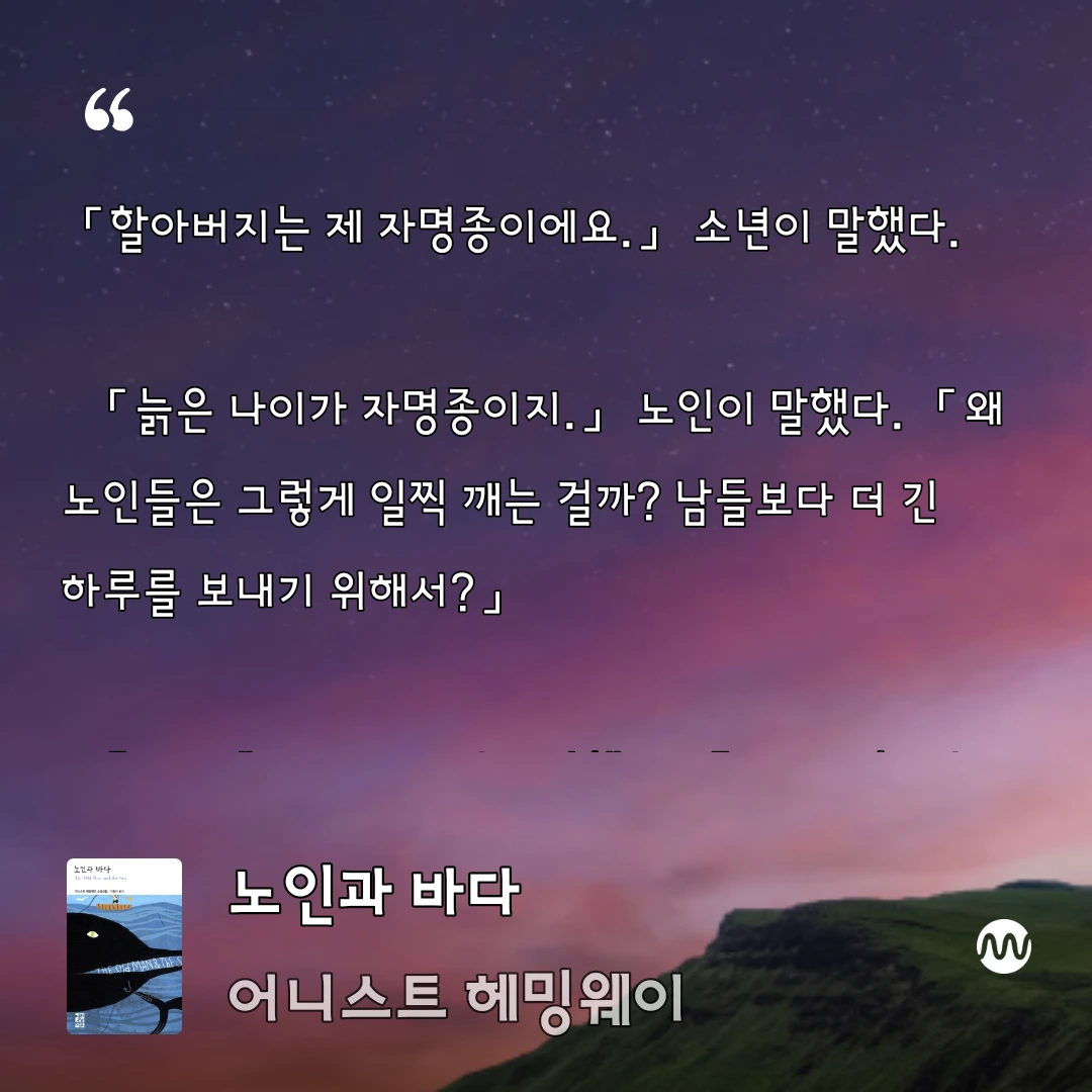 오랜만에 헤밍웨이의 [노인과 바다]를 읽기 시작했다. 책을 읽으면서 그때 어떤 감동을 받았는지 다시 기억해 내리라는 다짐을 해 본다.