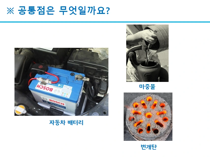 아래 그림의 배터리, 마중물 그리고 번개탄의 공통점은 무엇일까요? 네. 바로 이 3가지는 모두 자신을 희생하여 더 큰 무언가를 만들어 내는 역할을 한다는 것입니다.