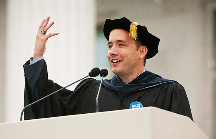 2013년 MIT 졸업식장. 드롭박스(Dropbox)의 공동 창업자이며 CEO인 드류 하우스턴(Drew Houston)은 졸업식 초청 연단에서 있습니다.