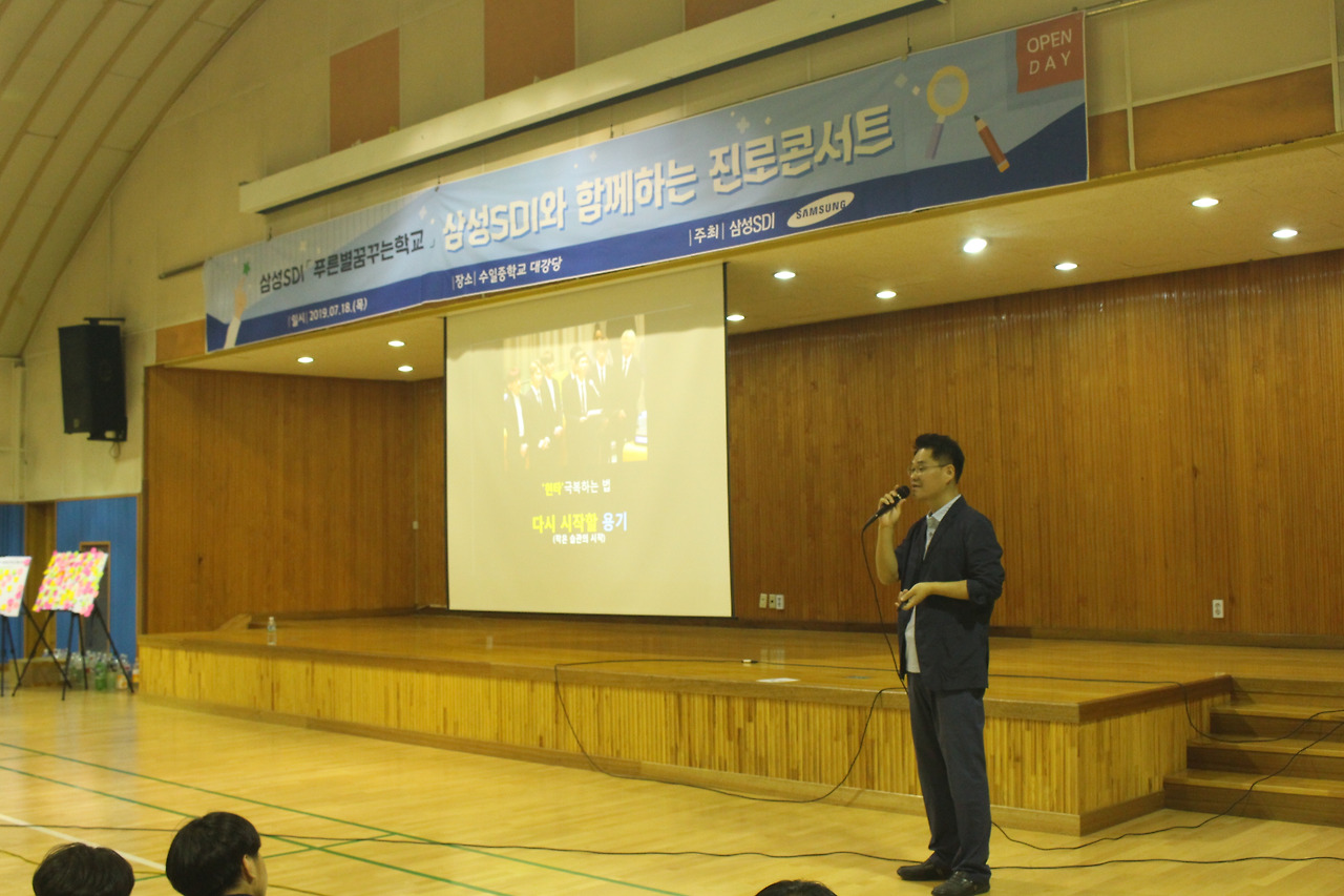 제가 배정된 학교는 수원에 위치한 '수일 중학교'였어요. 대상은 중학교 1학년부터 3학년까지 약 300명의 학생들이었어요. 어찌나 천방지축이고 장난꾸러기들 인지 강연장이 엄청 시끄러웠지만 그만큼 활기도 가득했었습니다.