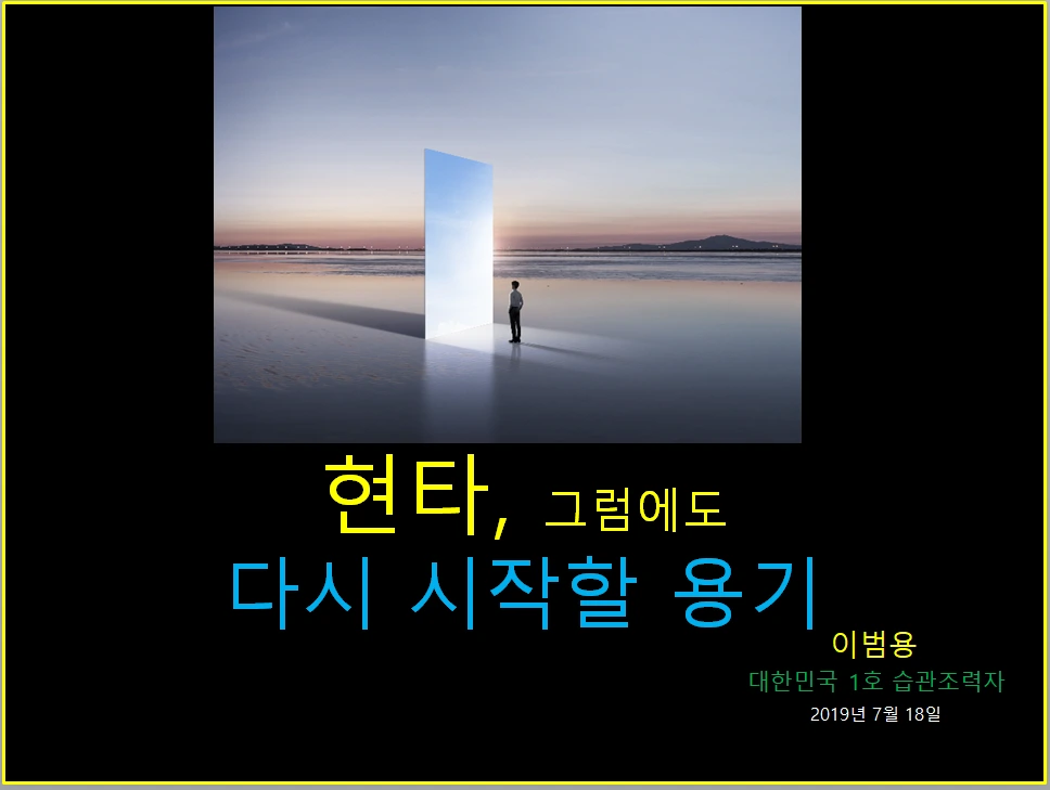 제가 준비한 주제는 '현타, 그럼에도 다시 시작할 용기'라는 주제로 강연을 했습니다. 강연을 시작하면서 제 소개를 했는데요. 저는 회사에 다니는 직장인이지만, '대한민국 1호 습관 조력자'로도 활동하고 있다고 말했어요. 그러면서 무작정 다른 사람의 꿈을 따라 하는 것도 나쁘진 않지만, 지금은 세상에 없을지라도 내가 1호가 되어 새로운 직업을 창조하는 것도 의미 있다고 말하면서 강연을 시작했습니다.