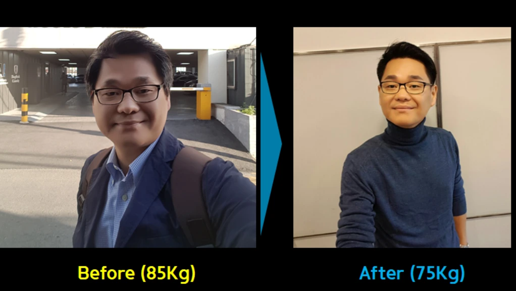 아래 사진은 다이어트하기 전인 85Kg 나갈 때 사진과 10Kg 체중 감량에 성공한 모습을 비교한 사진입니다.