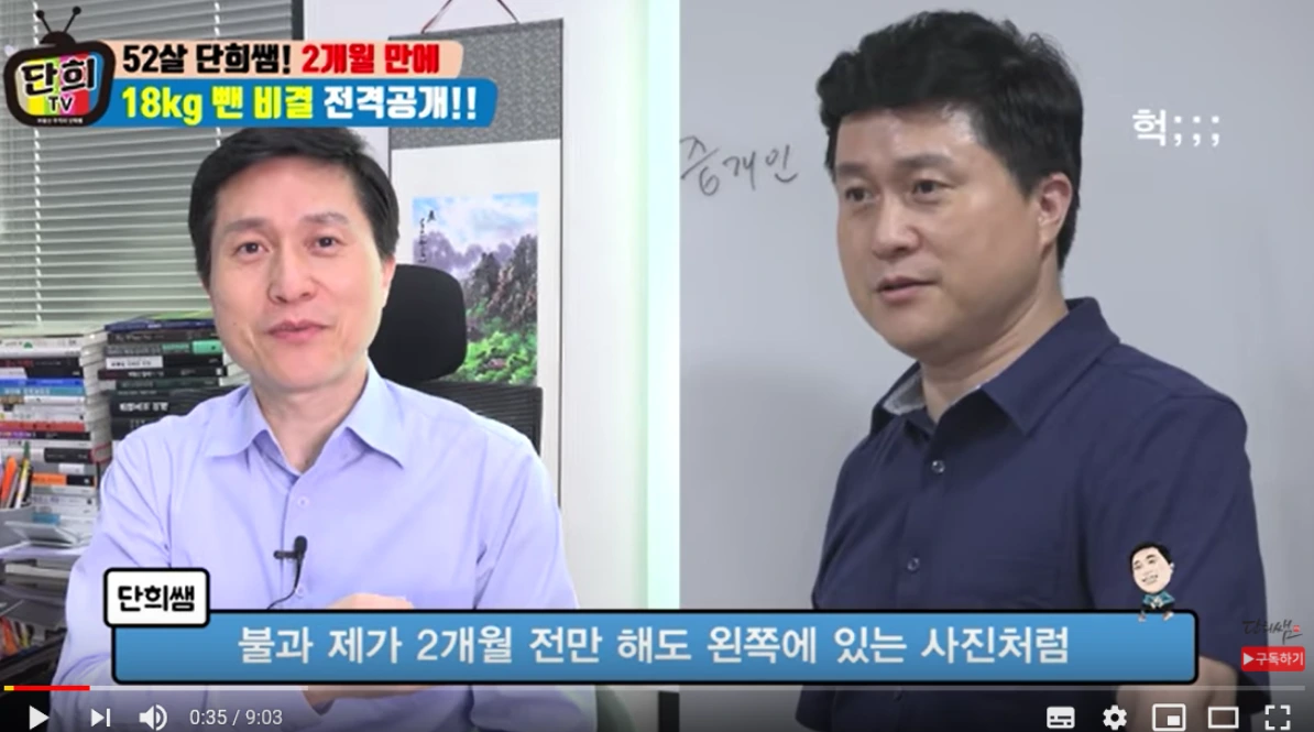 참~!! 마지막으로, 제가 왜 다이어트를 시작했는지 그 계기를 말씀드리고자 합니다. 우연한 기회였는데요. 어느 날 부동산 재테크 전문가로 활동하고 있는 단희쌤(53세, 2개월 만에 18Kg 감량)의 유튜브 영상을 보고 저도 다이어트를 따라 하게 되었습니다.
