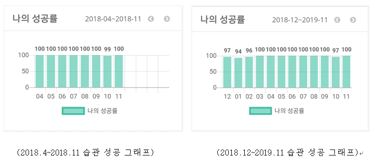 아래 표는 최경희 님 19개월 동안의 습관 성공률 그래프입니다. 거의 모든 달이 100% 성공률을 달성했음을 보여주고 있습니다. 그녀는 어떻게 이런 놀라운 성공률을 달성할 수 있었을까요?