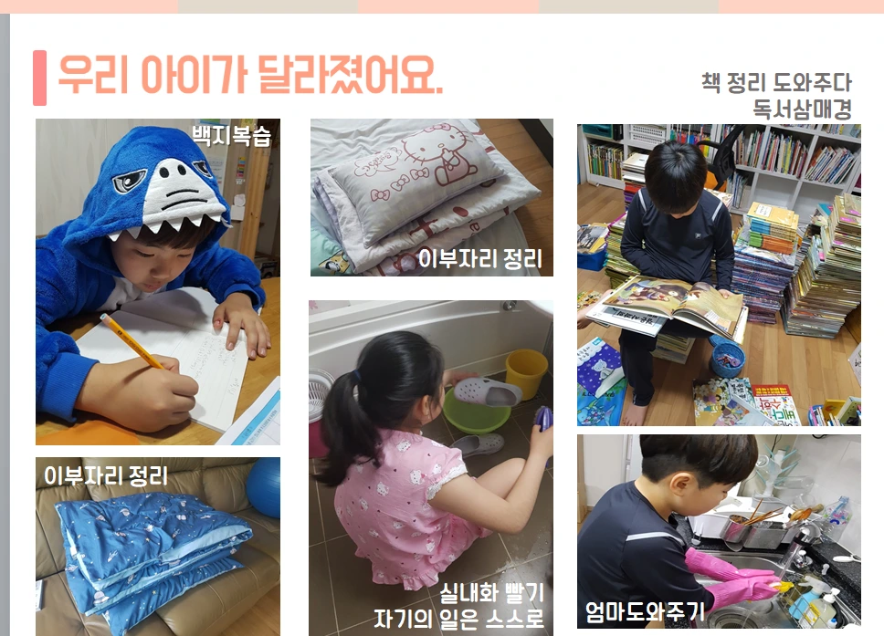 그 결과 아이들의 현재 모습입니다. 학교 갔다 와서 백지에 그날 배운 내용을 정리하는 백지 복습도 하고 자고 일어나서 이불도 정리하고 책 정리 도와주다가 독서 삼매경에 빠지기도 합니다. 본인 실내화는 스스로 알아서 빨고 설거지 등 엄마 일도 도와주는 아이로 변했답니다.