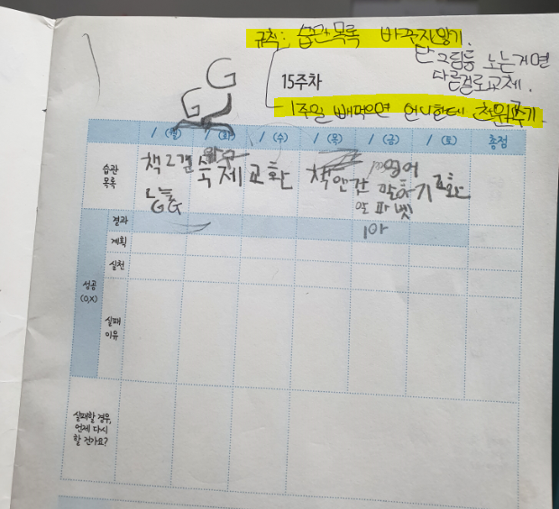 그런데 애초에 습관 목록을 정할 때 그림(낙서 수준)이나 놀기처럼 좋은 습관과 거리가 먼 습관을 하겠다고 기록해 놓는 경우는 좋은 습관으로 교체하기로 약속을 해 놓았네요. 규칙 두 번째는 일주일 습관을 전부 실패하면 언니에게 천원 주기라고 정했네요.
