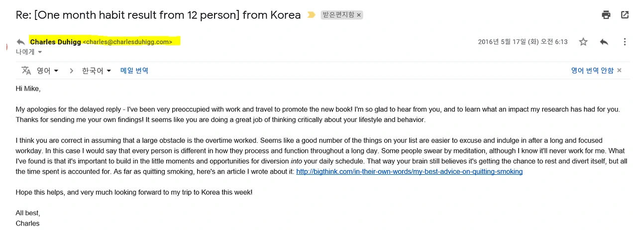 그래서 전문가의 도움을 받기로 결심했습니다. 바로 다음 날, 세계적인 습관 전문가이며 <습관의 힘>을 쓴 찰스 두히그에게 이메일을 보냈습니다. 그런데 놀랍게도 그에게서 답변이 왔습니다.