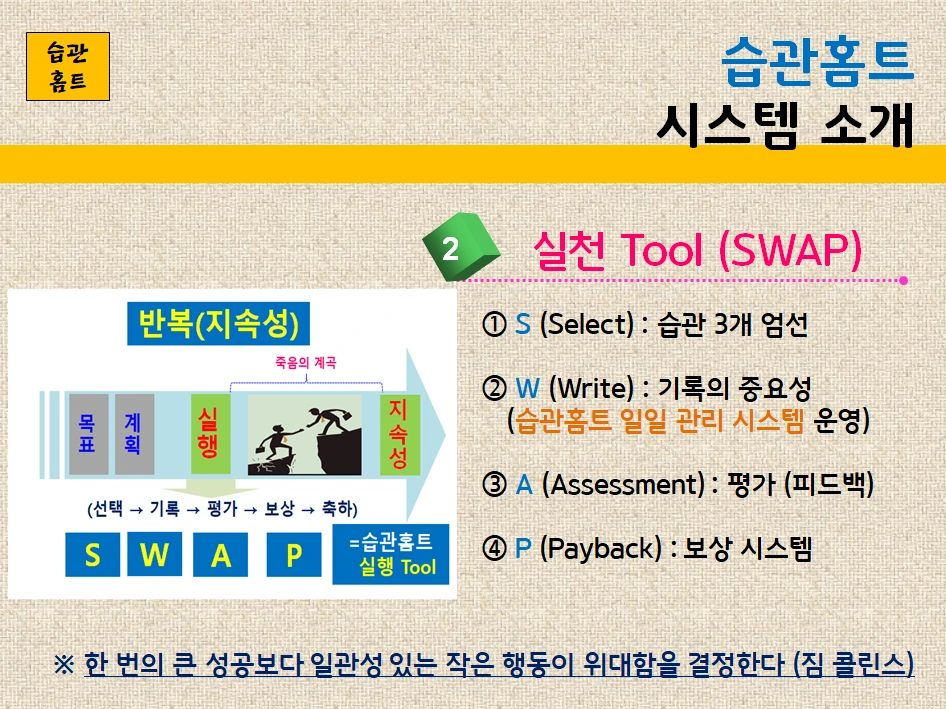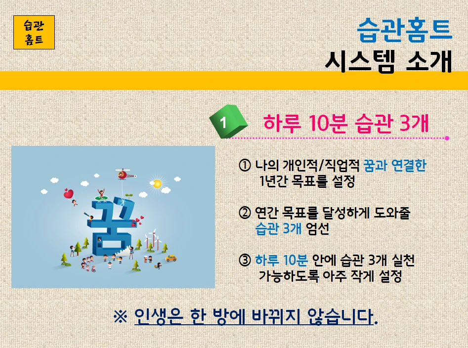 요약하면, 습관홈트의 차별화된 프로세스와 시스템은 하루 10분, 습관 3개, SWAP 실천 Tool, 그리고 습관홈트 일일관리 시스템으로 구성되어져 있다.