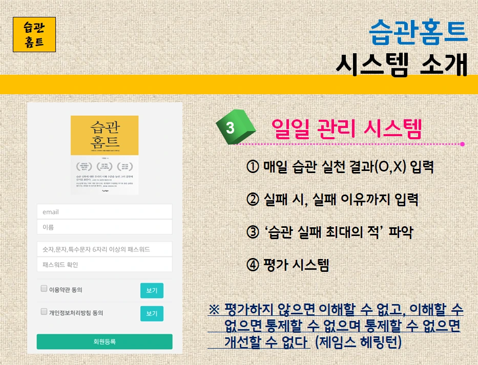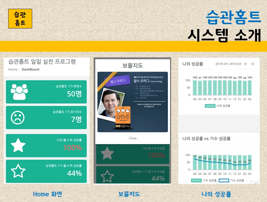 습관홈트는 자신의 직업적 또는 개인적 목표를 달성하게 도와줄 수 있는 핵심 습관 3개를 엄선하여 하루 10분 안에 실천하는 프로그램이다. 그리고 무엇보다 3년 동안 300명 이상이 검증한 프로세스와 <습관홈트 일일관리 시스템> 이란 웹 기반 프로그램에 매일 습관 결과를 입력함으로써 나의 습관 실패 최대의 적은 무엇인지 파악할 수 있다.