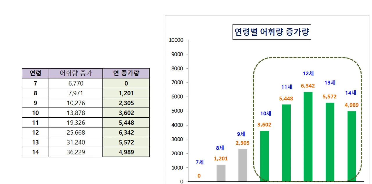 10세 때는 3,602 단어만큼 어휘가 증가하고 11세 때는 5,448 단어만큼 늘어나다가 12세 때는 6,342 단어까지 증가합니다. 즉 습득 어휘가 급속도로 증가하는, 이른바 '어휘력 폭발시기'가 이 시기에 시작된다고 합니다.