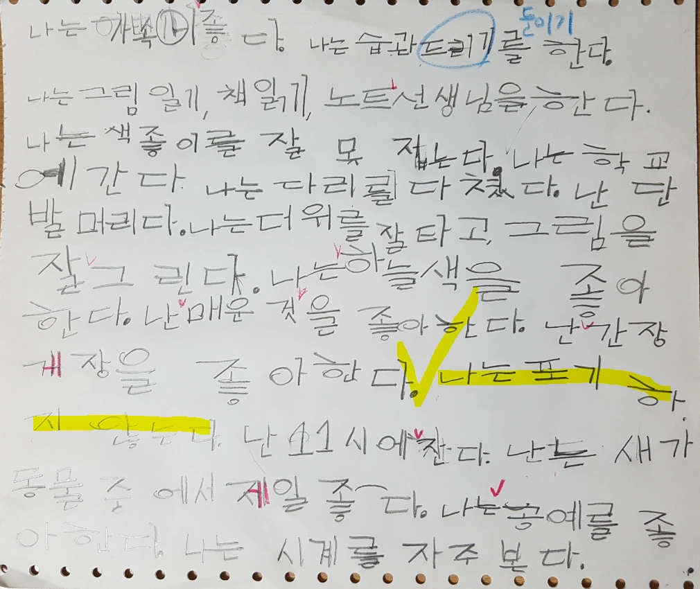 은율이가 실천한 글씨 쓰기 연습한 내용을 천천히 읽어보다가 내 눈을 사로잡은 문장이 있었다. 밑에서 4번째 줄에 이렇게 쓰여 있었다.