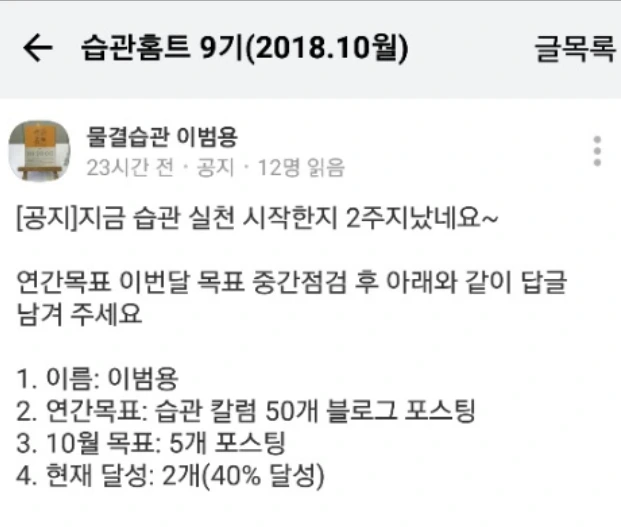 그러나, 현실은 녹록하지 않지요. 계획을 세울 때의 기쁜 마음은 그리 오래가지 않습니다. 멋진 계획과 실행은 엄연히 다른 말이기 때문이지요. 그래서 제가 운영하고 있는 #습관홈트 프로그램(현재 1기부터 14기까지 약 300명 참여 중)에 참가하는 사람들은 처음부터 목표를 세울 때 시작이 쉽도록 작게 설정하고 있습니다.
