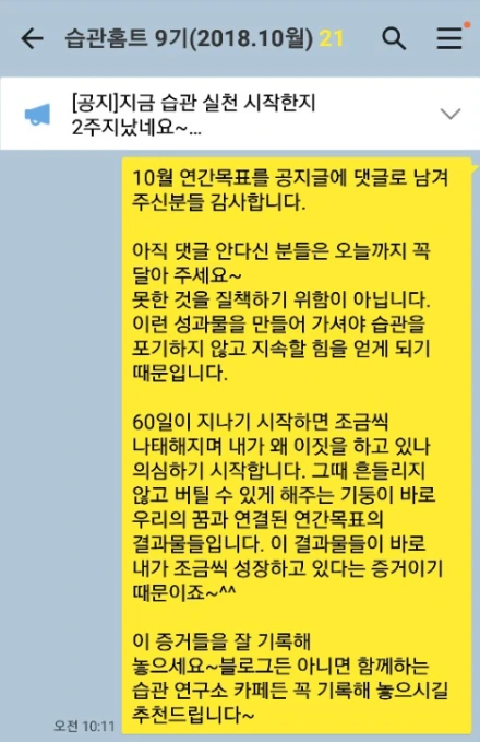 라고 자기 합리화를 시작합니다. 이 의심의 시발점은 바로 "습관을 지속할 의미"를 상실했기 때문입니다. 그래서 습관 시작하기 전에 3개의 습관 목록이 자신의 개인적 또는 직업적 꿈과 단단하게 연결되도록 습관 목록을 잡는 것이 중요합니다. 그래야 죽음의 계곡에 접어드는 시기인 60~90일 사이에 스스로의 의심으로부터 벗어 나 앞으로 계속 전진해 나갈 수 있게 됩니다. 그 해결책으로 저는 습관홈트 프로그램 참가자들에게 연간 목표를 카톡으로 매월 점검하도록 독려하고 있습니다.