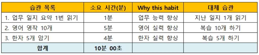 습관홈트 프로그램에 참가 중인 다른 분의 습관 목록도 업무일지 요약 1번 읽기, 영어 영작 10개, 한자 5개 암기 총 3개의 습관을 하루 10분 안에 모두 실천할 수 있을 만큼 작게 설정한 후 매일 실천하고 있습니다.