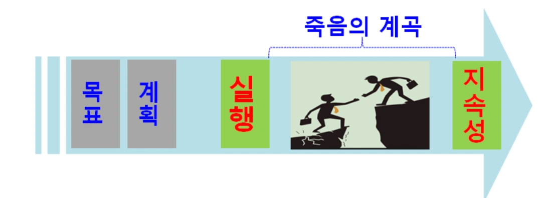 목표를 설정하고 계획을 세우고 실행을 하더라도 포기하지 않고 죽음의 계곡을 뛰어넘어 지속할 경우에만 우리가 원하는 목표를 달성할 수 있습니다. 여기서 중요한 것은 바로 '죽음의 계곡'이란 최대 장애물입니다.