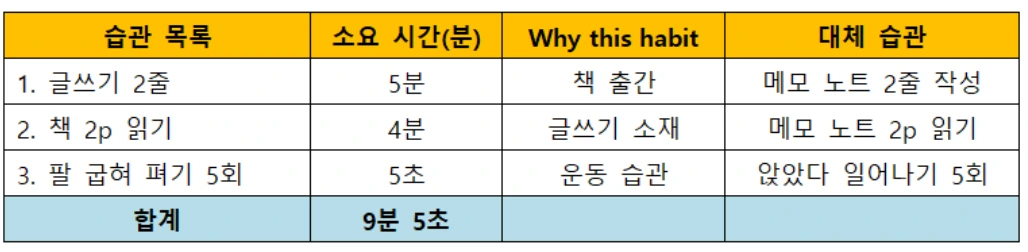 저의 습관 목록 3개는 글쓰기 2~3줄, 책 2p 읽기, 팔 굽혀 펴기 5회로 구성되어 있으며 총 9분 5초 만에 모두 실천할 수 있습니다. 혹자는 이렇게 생각할 수 있습니다. '에이~이렇게 사소하고 작은 습관을 실천해서 뭔가 변화가 있겠어요?' 라고말이지요. 당연한 의심입니다. 하지만, 짐 콜린스가 강조한 것처럼, 한 번의 큰 성공보다 일관성 있는 작은행동이 위대함을 결정합니다. 그 증거는 습관홈트 프로그램에 참가하여 변화에 성공한 많은 사람들의 이야기를 확인하면 금방 알 수 있습니다.