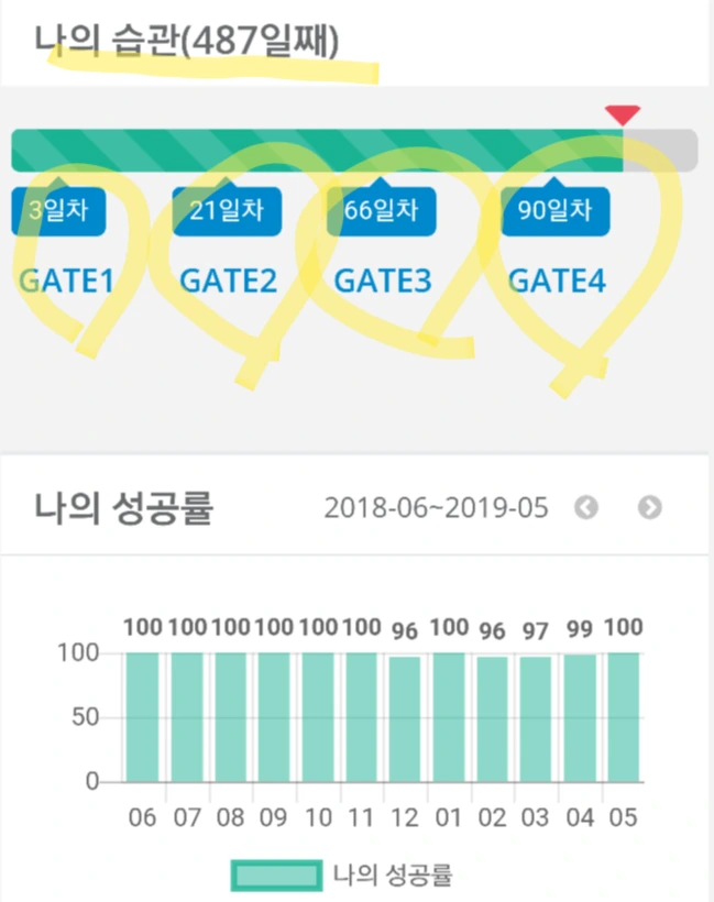 그리고 화면을 조금만 밑으로 내리면(모바일 화면 기준) 4개의 Gate(관문)가 나옵니다. 4가지 관문은 습관을 시작한 지 3일, 21일, 66일 그리고 90일이 지난 시점을 일컫습니다.