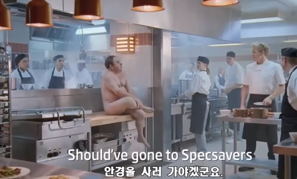 이 광고 속 중년 남자의 목적은 사우나였지만 주방에서 일하는 사람들의 눈에는 그가 노출증 환자처럼 보일 수밖에 없다.