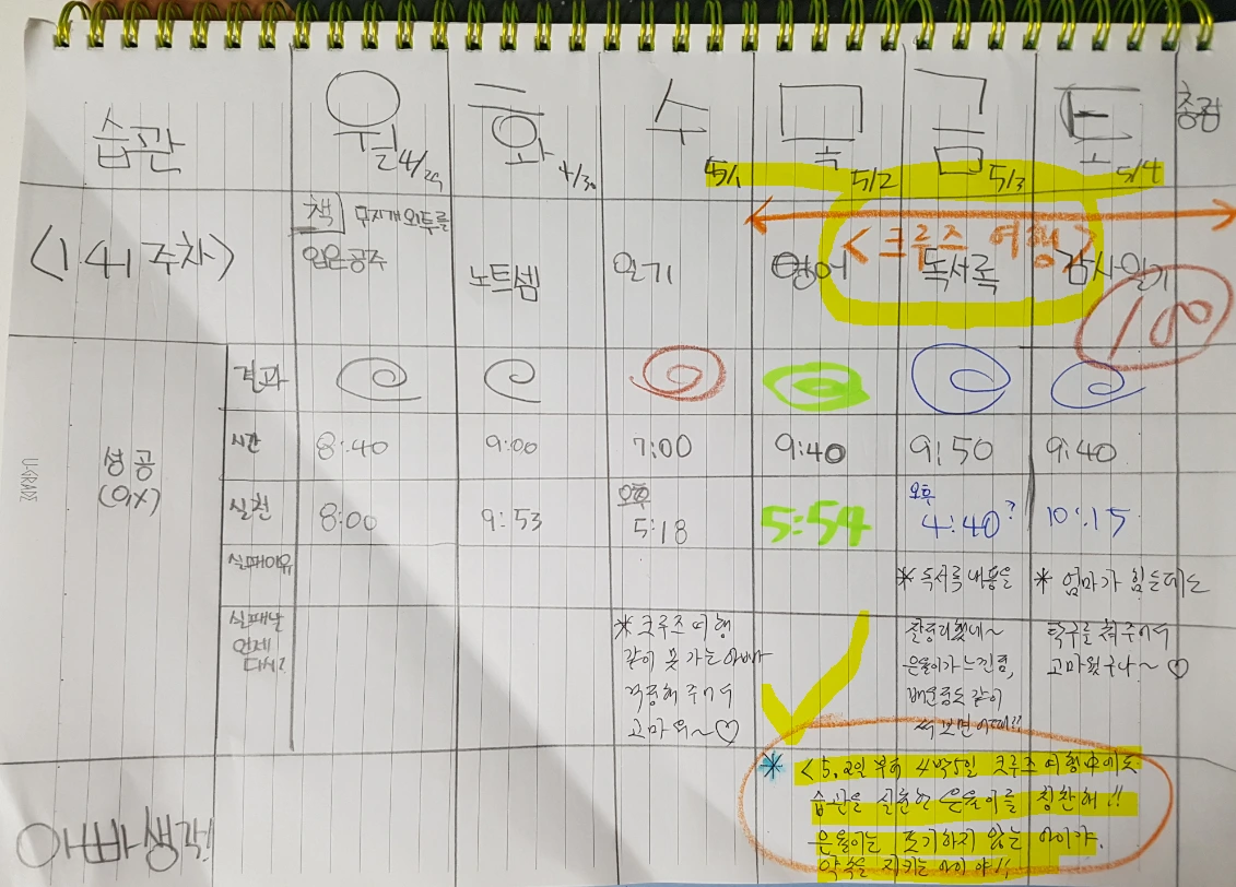 5월 2일부터 5월 6일까지 크루즈 여행을 갔다 왔으니 141주차 습관 계획표 중 3일 동안은 여행 중에 습관을 실천한 것이다.