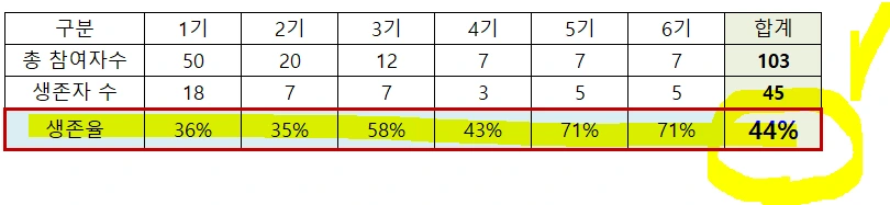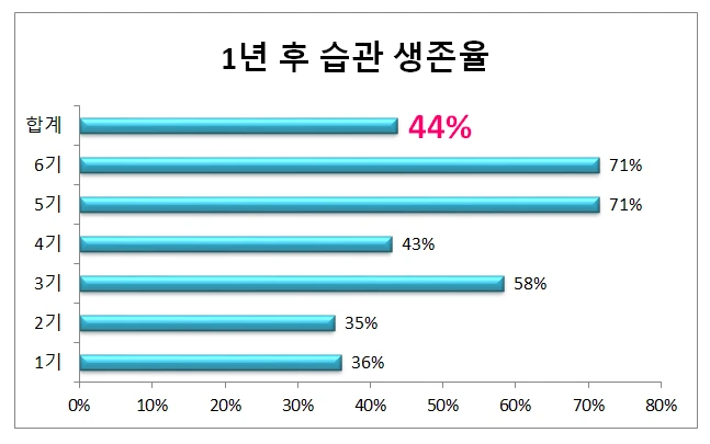 1기부터 6기까지 총 103명이 참가를 했고1년이 지난 지금 45명이 습관을 포기하지 않고 계속 실천해 오고 있다. 생존율을 계산해 보면 약 44%가 된다.