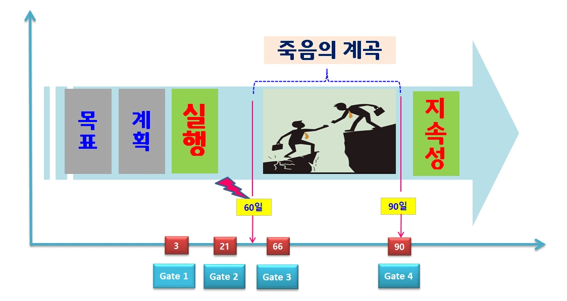 또 다른 유의미한 습관 데이터를 예를 들면, 대부분의 참가자들이 습관 시작 후 60~90일 사이에 50% 이상 포기하거나 성공률이 급락하는 추세를 보이고 있다는 점이다. 나는 이 시기를 ‘죽음의 계곡’이라고 이름을 붙였다.