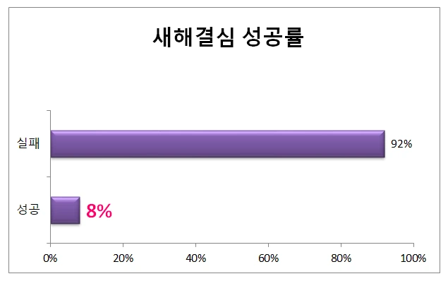반면에, 미국의 설문 조사 기관인 '통계 브레인'에서 발표한 자료에 의하면 새해 결심 한 사람 중 92%가 실패하고 오직 8%만 성공한다고 발표했었다.