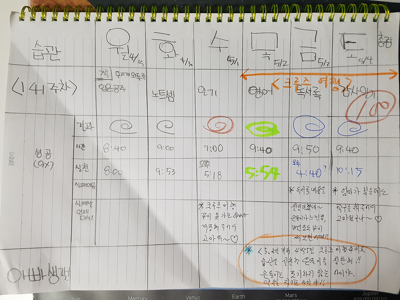 최근에 은율이는 정말 오랜만에 엄마와 함께 크루즈 여행을 다녀왔다. 4박 5일 동안 긴 여행이었다. 아빠인 나는 회사에서 중요한 보고가 있어서 함께 가지는 못해서 아쉬웠다. 내심 긴 여행 중에 습관을 까먹고 못할 수도 있겠다고 생각을 했었다. 하지만 은율이가 여행에서 돌아온 후 습관 계획표(아래 141주 차 습관 계획표 참조)를살펴 보니 모두 성공했다고 표기를 해 놓은 것이다.