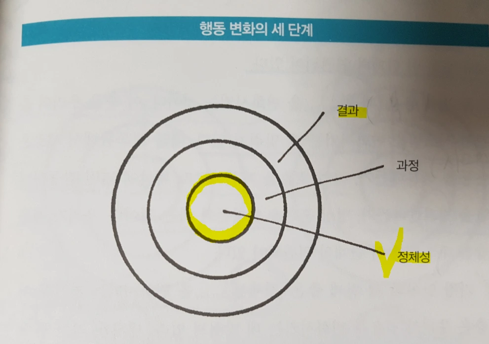 중요한 사실은 이렇게 정체성 중심의 습관에서 시작해야 오래 습관을 지속할 수 있고 변화에 성공할 수 있다. 왜냐하면 인간은 나에게 적합하지 않은 행동은 오래 유지하려 하지 않기 때문이다. '그 일은 나답지 않아'라고 되 뇌이며 우리 뇌는 저항하기 시작하기 때문이다.