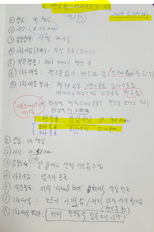 두 번째 위기는 약 2시간 뒤에 찾아왔다. 난 골치 아팠던 업무 하나를 막 처리해서 살짝 안도감이 밀려오는 상태였다. 이 안도감은 바로 보상을 원한다는 신호였다. 핸드폰에 새로운 소식이 없는지 무척 궁금해졌다. 하지만 1차 대응으로 다이어리를 펴고 이 기록을 하기 시작했다. 그리고 커피를 타기 위해 자리를 벗어났다. 핸드폰은 내 책상에 남겨두고 미련 없이 자리를 떠났다. 1차 대응 결과 커피 한 모금을 마시고 다시 업무를 시작할 수 있었다. 그리고 오후엔 별다른 위기 없이 업무에 집중하여 일을 처리했다.