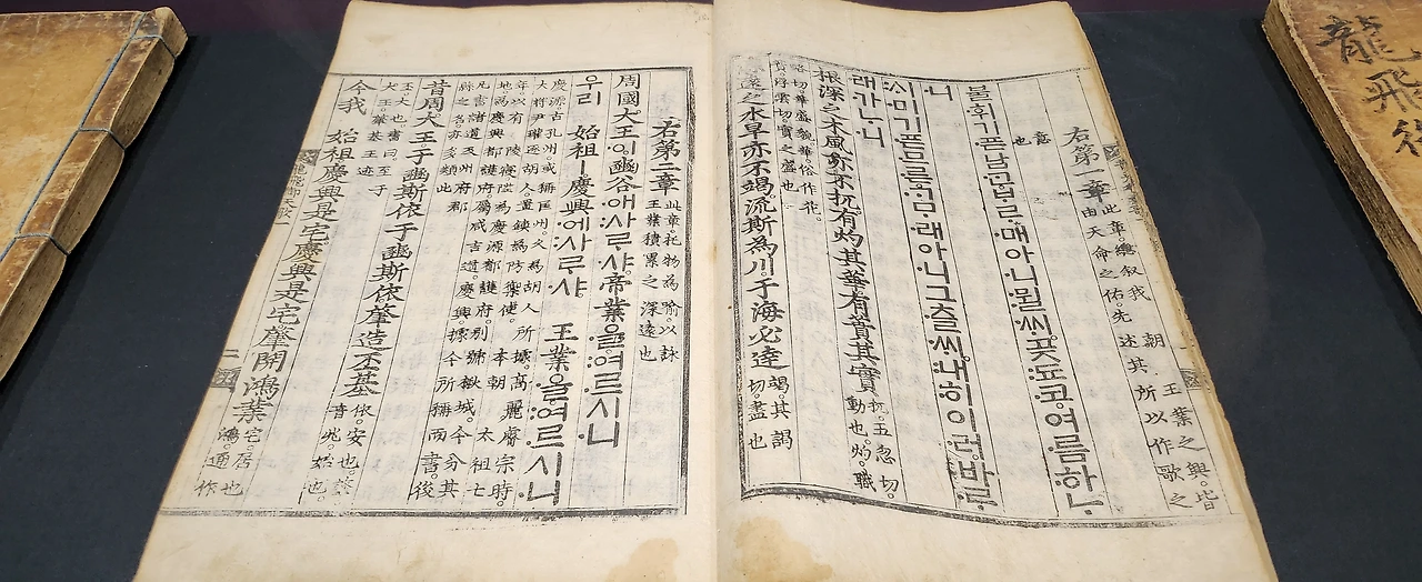우리 선생님은, 이 용비어천가에서 한글이 차지하는 비율이 어느 정도냐는 질문도 하셨단다. 와우! 나는 그런 게 하나도 안 궁금했는데, 그 말을 듣고 보니 용비어천가는 우리말로 쓴 책인데 한글 두 줄에 한문이 주루룩 적혀 있으니 이상하기도 했다. 그 직원분은 용비어천가에서 우리말은 약 10~15퍼센트로 그 옆의 한문은 뜻을 설명해 놓은 각주라고 하셨다. 고작 10~15퍼센트? 적다는 생각이 들지만 만들어진 시기가 세종 때임을 감안하면 상당히 많이 들어간 편 아닐까 하는 생각도 든다.