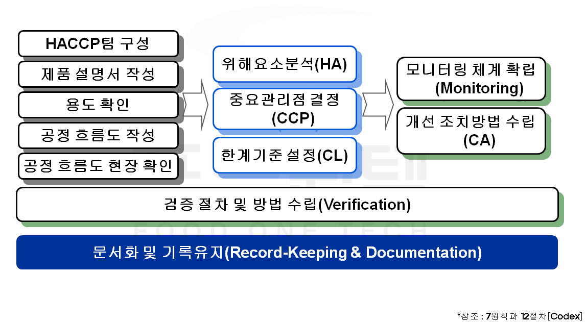 주의할 사항은 최고 경영자는 HACCP 팀을 운영할 때 Codex나 정부에서 말하는 HACCP 12 절차를 준수해야 한다는 점이다. 여기서 꼭 기억해야 할 것은 12 절차에서 ‘절차’라는 단어이다. 절차는 ‘일의 순서’라는 뜻을 갖고 있으므로 HACCP 팀은 12 절차의 순서를 그대로 따라서 추진하기 바란다. 절대로 절차를 건너뛰거나 순서를 바꾸지 말아야 한다. 12 절차는 준비단계 5 절차와 HACCP 7 원칙로 구성된다.