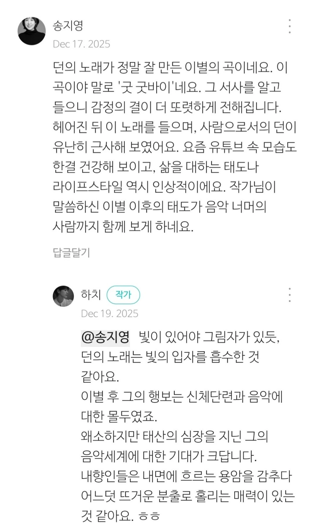 던의 사랑은 끝났지만, 그의 음악은 그 사랑을 놓지 않는다. 다만 더 이상 한 사람의 빛에 의존하지 않는다. 이제 그는 자신이 통과한 사랑의 잔광으로