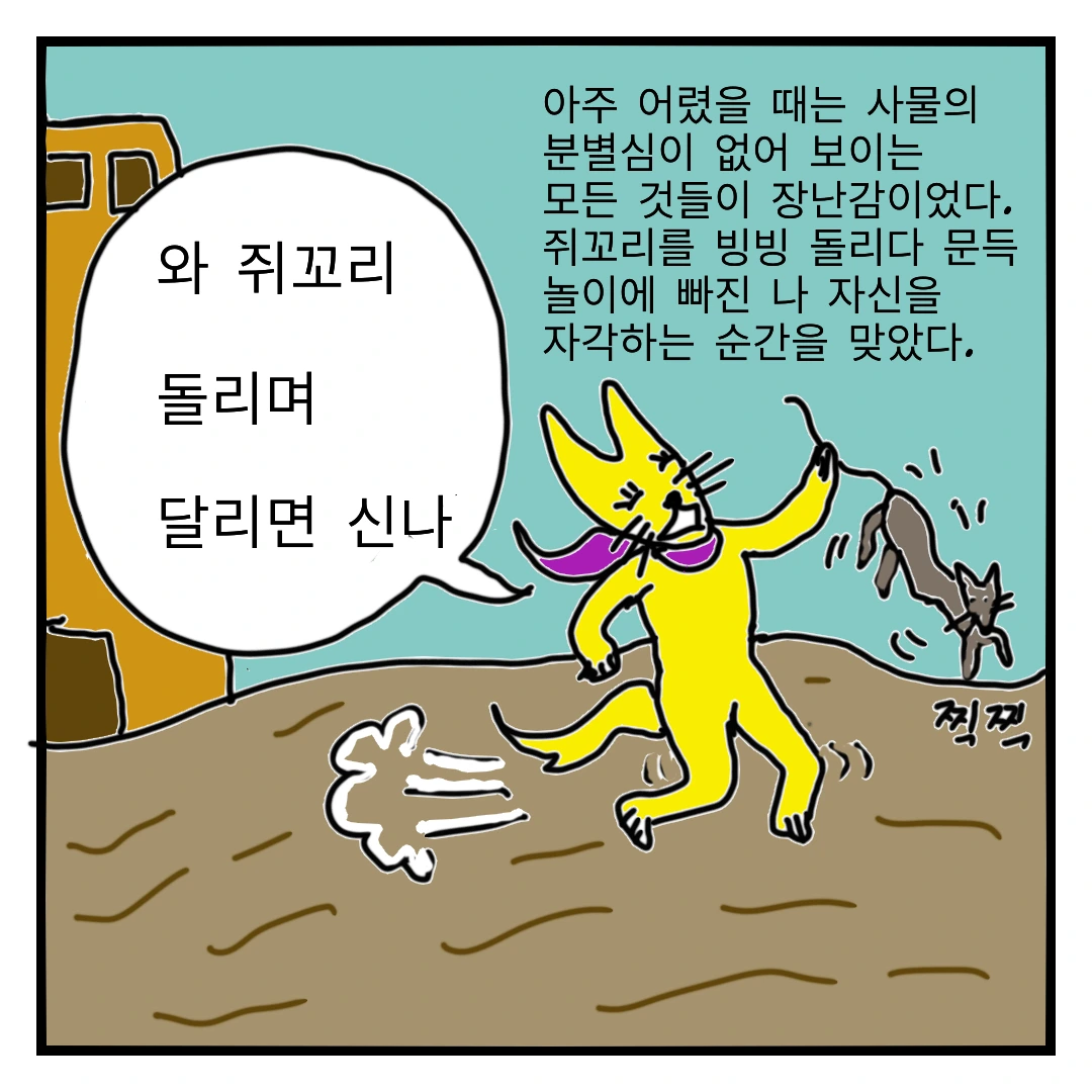 쥐가 더럽다느니의 분별심이 없이 생동한 꼬리를 마치 연 줄 놓치지 않으려는 고사리손이 신나게 움켜쥐었다.