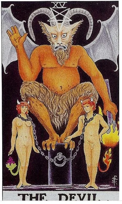 악마 카드의 두 사람의 머리에 난 뿔은 상대에 대한 투사의 공격으로 성이 난 뿔로 보이지 않나요