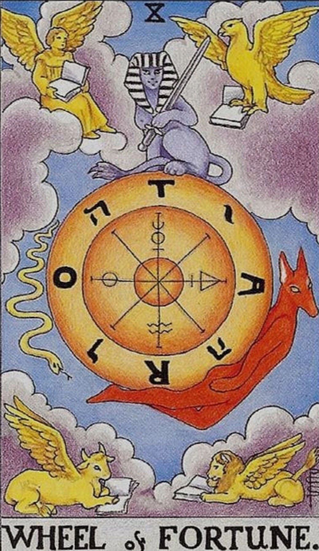 10번 운명의 수레바퀴 카드의 네 모퉁이의 4원소로 상징되는 생물들이 책을 읽고 있는 장면 있었지요.