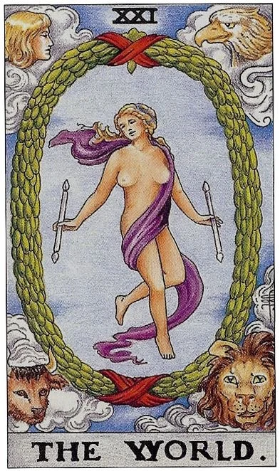 이 카드의 또 하나의 대응 카드는 앞서 말한 12번 매달린 사람인데, 12를 뒤집으면 21이 되며 12번 매달린 사람을 거꾸로 하면 세계 카드의 인물과 비슷한 자세가 되지요