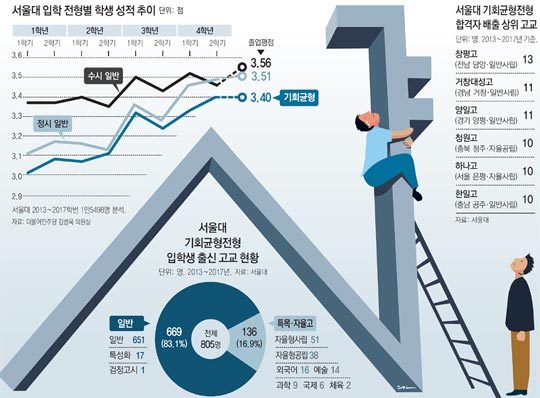 실제 기회균형 학생들과 다른 전형으로 들어온 학생들 사이의 성적격차도 크지 않다. 더불어민주당 김병욱 의원실에 따르면 2013∼2017년 서울대 기회균형 입학생(805명)의 성적은 상승 곡선을 그린다. 1학년 1학기 평균학점은 3.01로 전교생 평균(3.24)보다 낮다. 하지만 4학년 2학기에는 기회균형 학생의 평균학점(3.40)이 전체 평균(3.46)과 거의 차이가 없다. 서울대 B 교수는 “기회균형 학생을 위한 영어 수학 등 기초과목 학습 지원도 중요하지만 이들이 소외감을 느끼지 않고 당당히 어울리도록 심리적 지원이 필요함을 방증하는 데이터”라고 말했다.