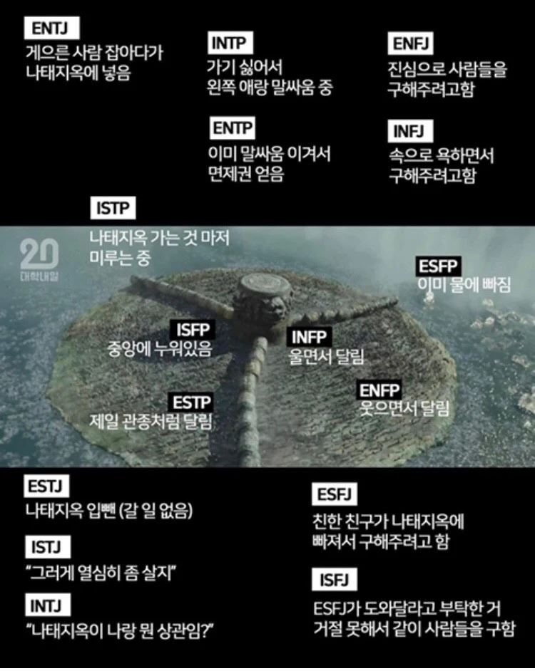 (재미 삼아 찾아본 건데, ENFP인 나는 저 지옥마저도 즐길 기세지만 ENFJ로 살짝 기울어진 지금 나 자신보다는 타인이 우선이겠구나 싶다. 지금의 나처럼?)